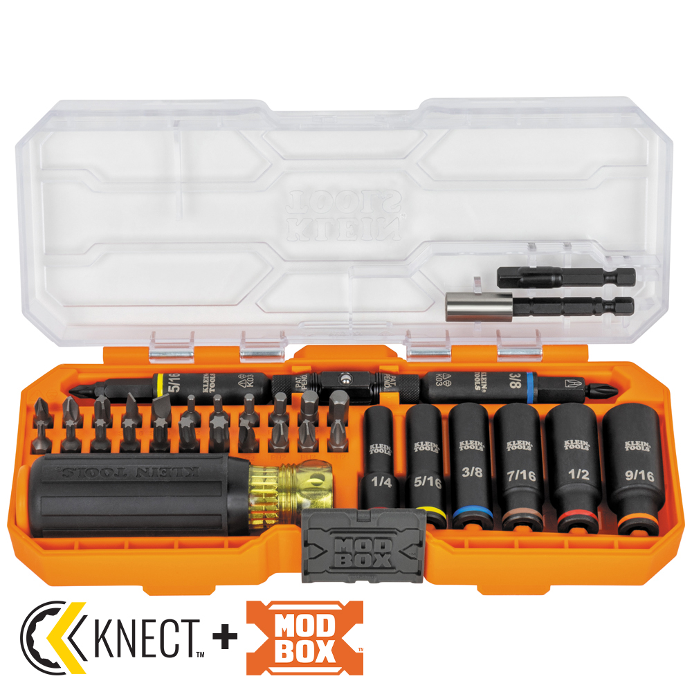 The Impact-Rated 41-Piece Screwdriver / Nut Driver Set is part of Klein's KNECTâ„¢ system. KNECTâ„¢ is a cross compatible impact-rated driver and ratchet system that delivers a seamless back and forth transition between hand and power tools. Houses popular screwdriver tips, nut driver sizes and deep well impact sockets. It's the familiar feel of a multi-bit screwdriver set, with the added utility to complete any job. Case clips to other Klein cases and the MODboxâ„¢ case adapter side rail attachment.
