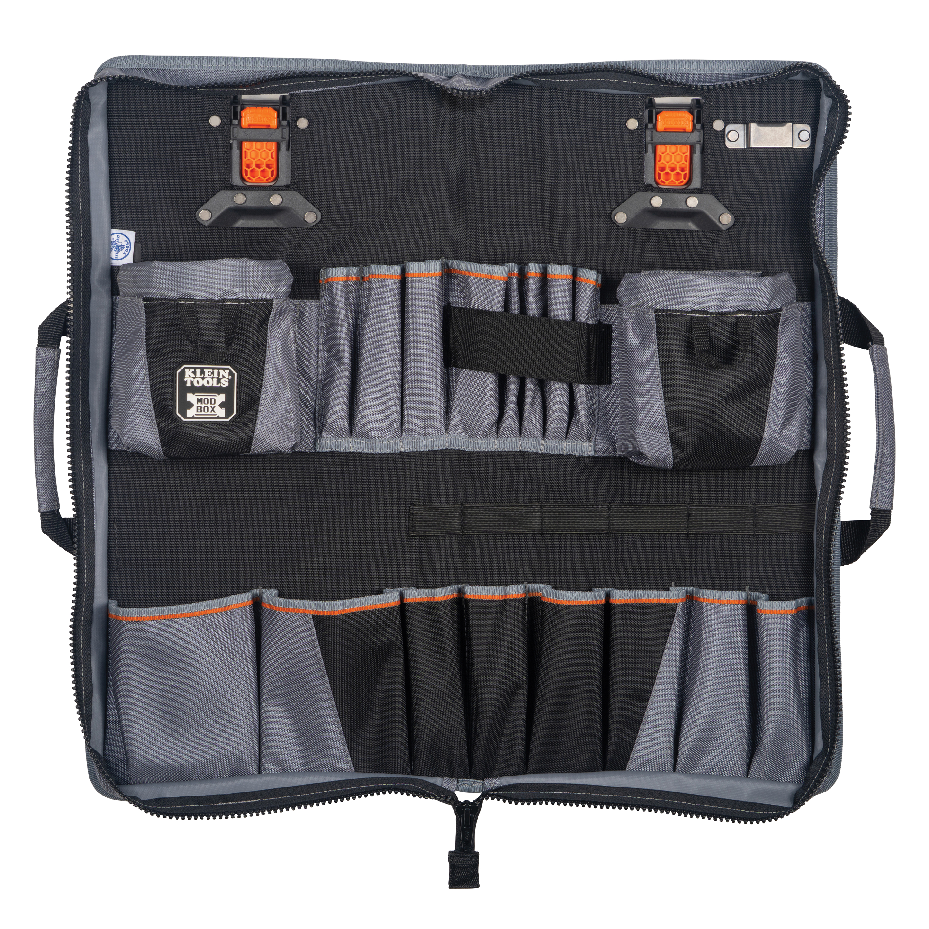 (18) Pockets for Tools and Materials, (2) Pockets With Flex Frame Closure, Folds in Half With Zipper Closure for Transport and Storage, Easily Attaches and Releases From MODboxâ„¢ Rail System